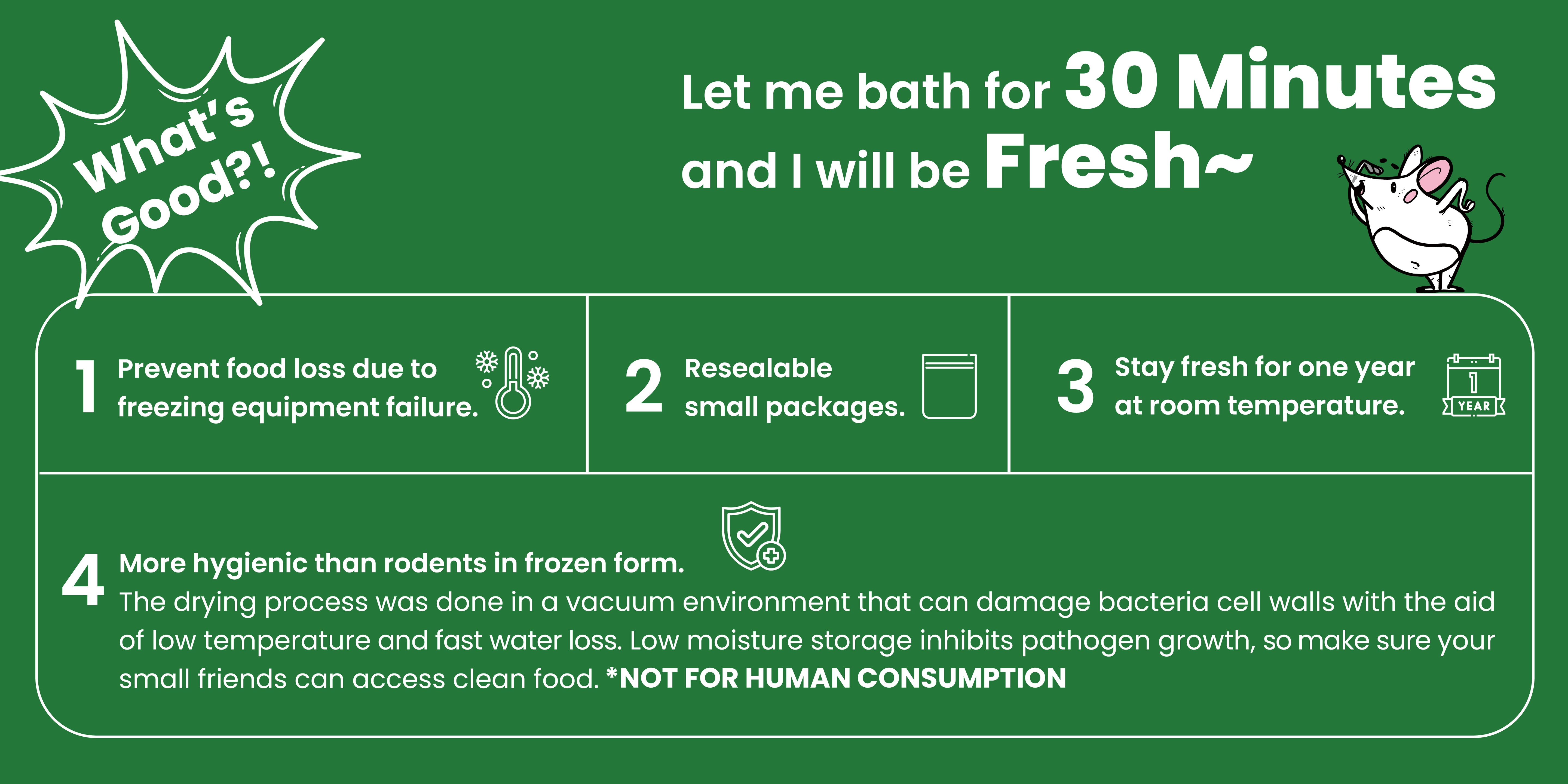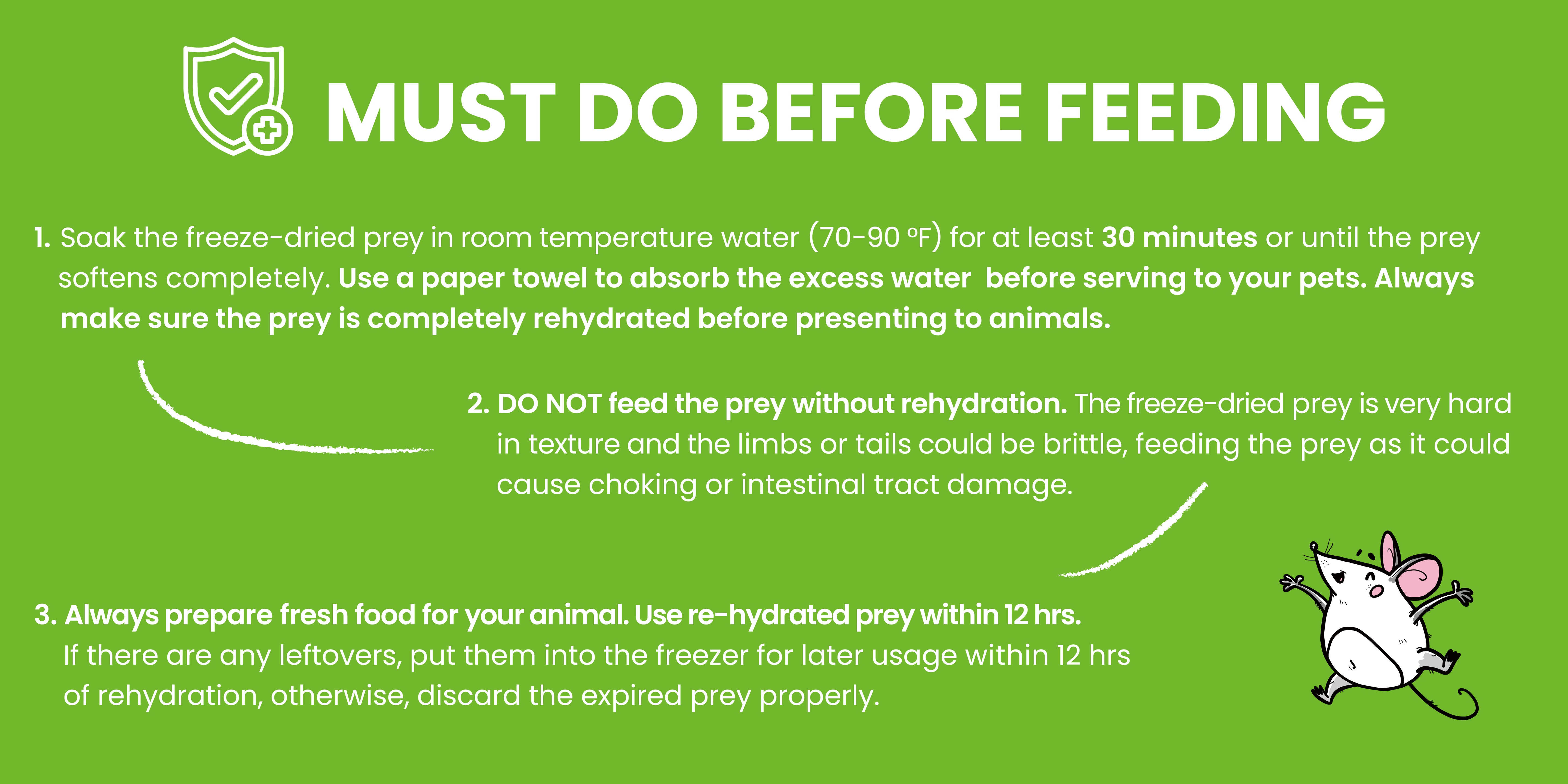How to prepare? Submerge rodents fully in room-temperature water for 30 minutes or more. Feed only when completely softened to ensure safe digestion. -